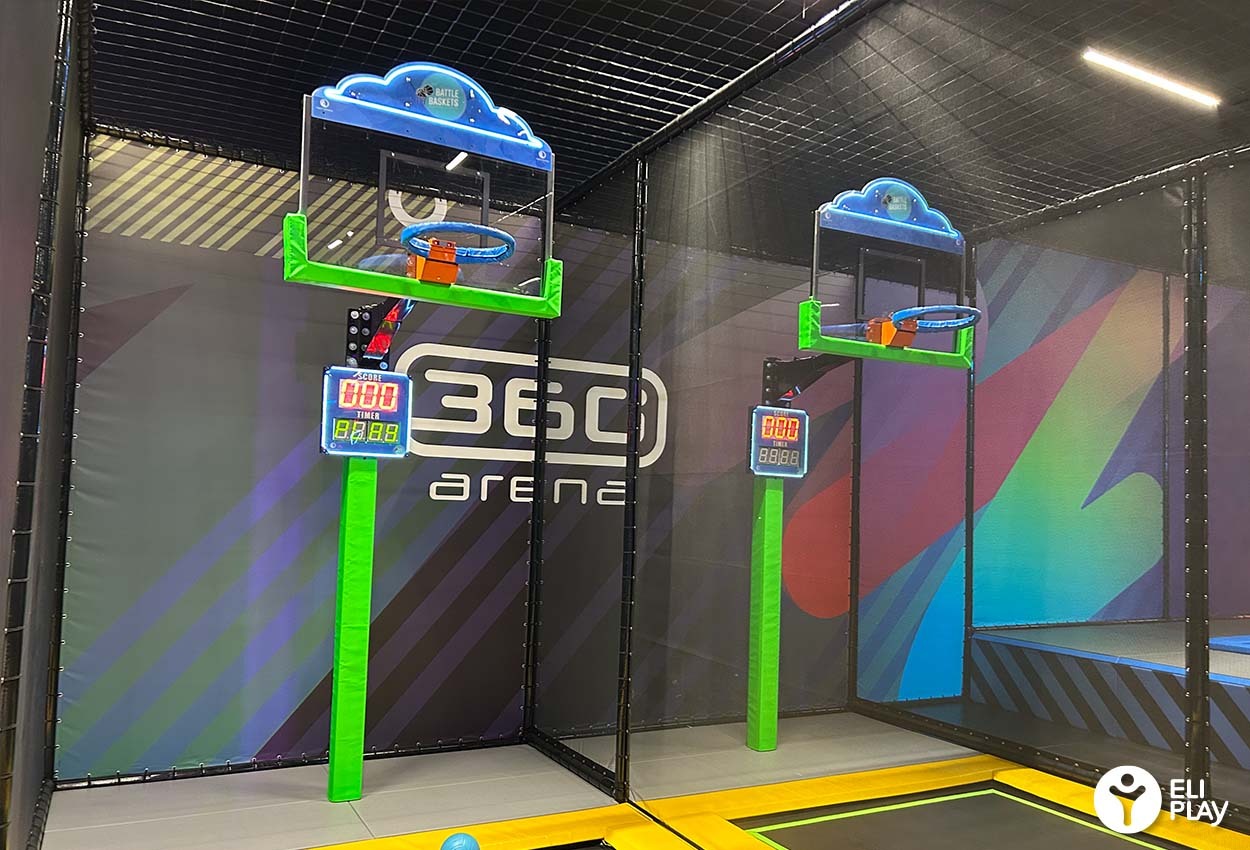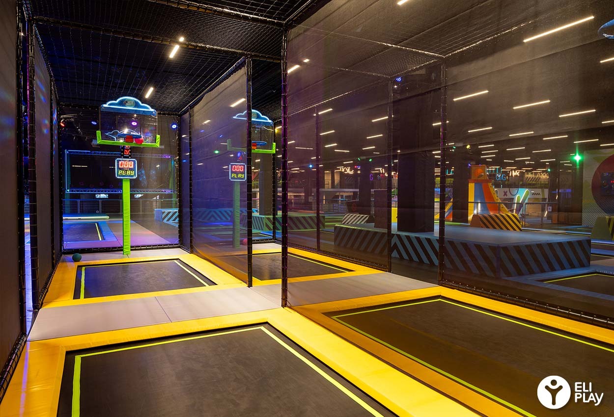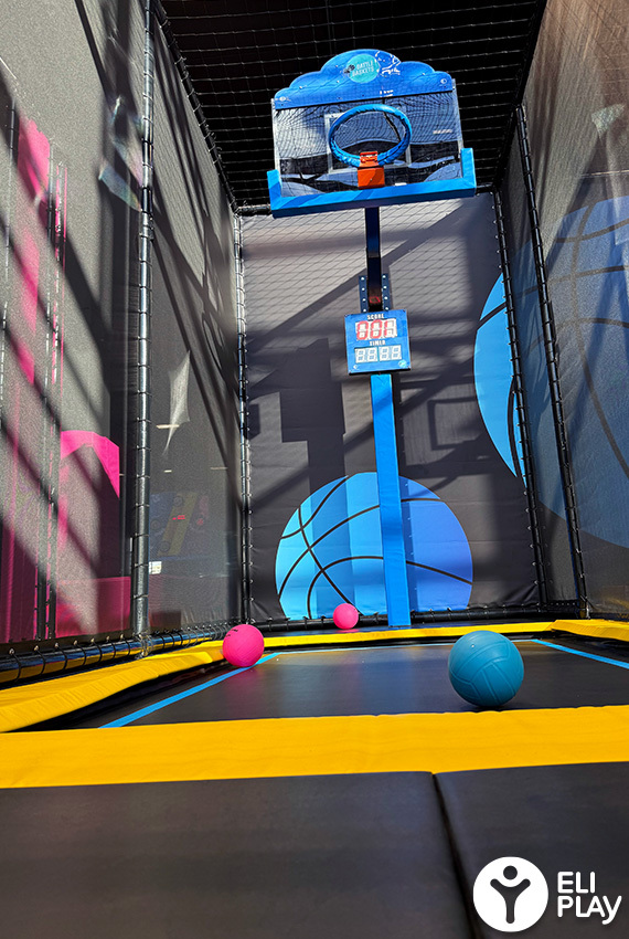 Voor de veiligheid in verband met het gebruik van een bal wordt de Dunk Zone apart opgenomen in een trampoline structuur.