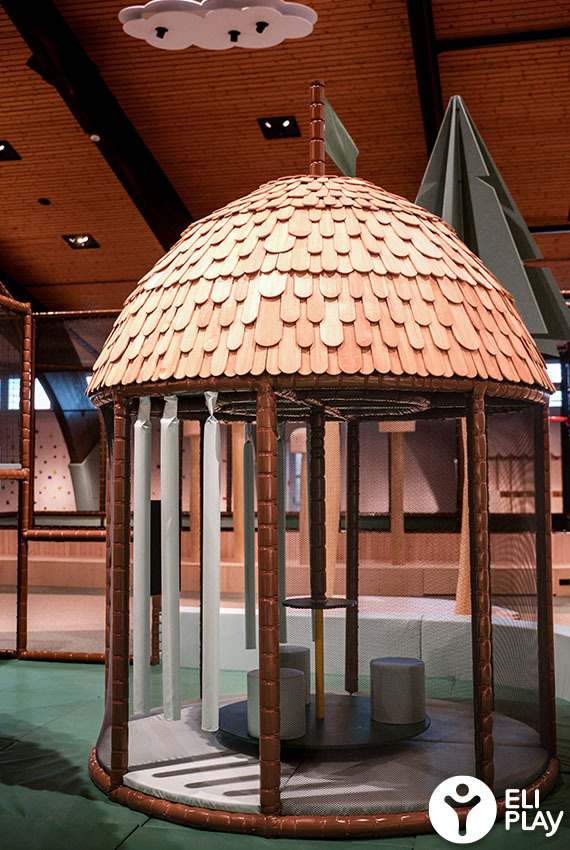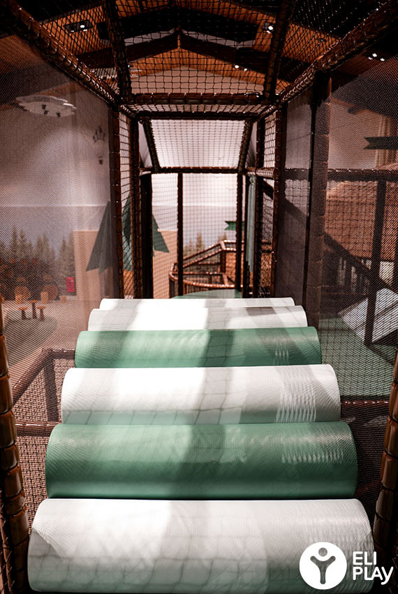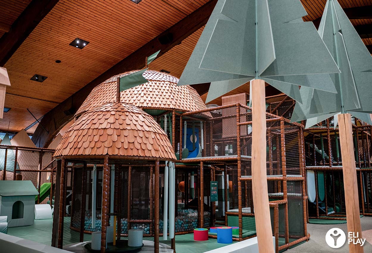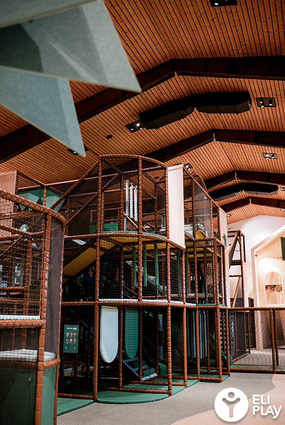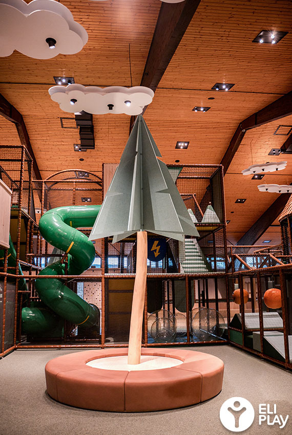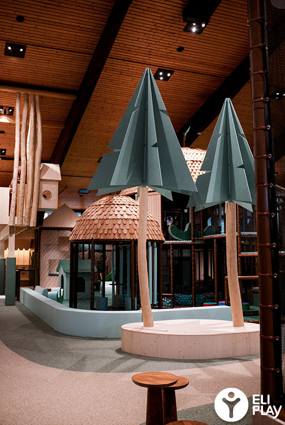 Bij het ontwerp van deze indoor speeltuin is bewust gekozen voor natuurlijke kleuren en materialen. Het warme bruin, diverse groentinten en de houten afwerking zijn geïnspireerd op het Zwarte Woud. Dit zorgt voor een warme, rustige uitstraling die past bij de hotelomgeving, terwijl kinderen worden gestimuleerd om te bewegen, te ontdekken en samen te spelen.