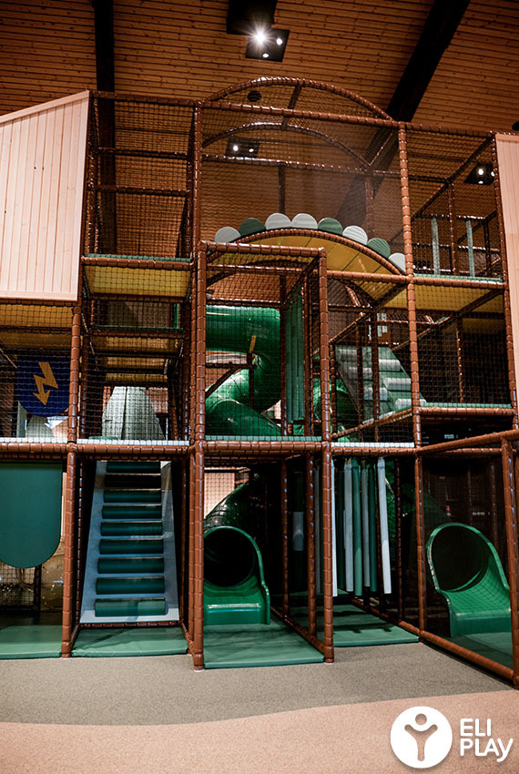 Het hart van de binnenspeeltuin wordt gevormd door een imposante Speelstructuur die kinderen uitnodigt om te klimmen, klauteren en op avontuur te gaan. De structuur zit vol met obstakels en Touwbruggen die kinderen moeten passeren om bij de verschillende Glijbanen op de hoogste verdieping komen. Daarnaast zijn twee ValoJump trampolines zijn in de speelstructuur geïntegreerd, waarin kinderen in een digitale wereld springen en hun bewegingen besturen om interactieve spellen te spelen. Dit combineert fysieke activiteit met digitale uitdaging en spelplezier.