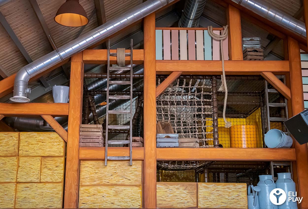 In het hart van de binnenspeeltuin bevindt zich een grote ballenbak met een dumping basket. De ballenbak is gevuld met beige en lichtbruine ballen, die symbool staan voor de eieren van de kippen op de boerderij. De ballen worden omhoog gezogen met de Ball Blower en vallen daarna als een vrolijke “ballendouche” naar beneden – een uniek speelelement dat het boerderijthema tot leven brengt en kinderen keer op keer verrast.